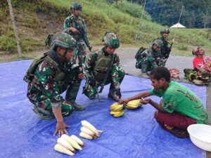 Waspira News || Puncak papua — Rosita, Wujud Kepedulian Prajurit satgas mobile Yonif 323 Buaya Putih membantu membeli hasil tani masyarakat yang di jual mama-mama. Papua di depan TK Pintu Jawa, Kabupaten Puncak, Papua, Rabu (19/06/2024).