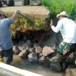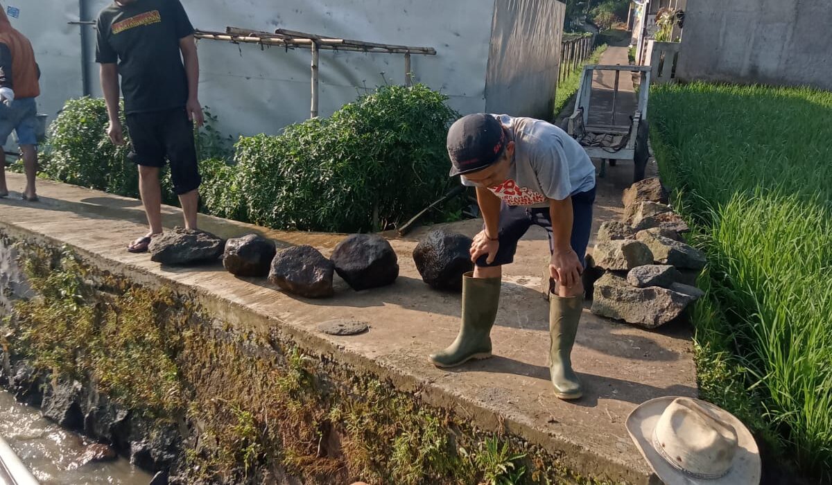 Seorang warga mengenakan topi jerami dan sepatu bot hijau tampak memberi instruksi, sementara yang lain turun langsung ke dalam air untuk menata batu.